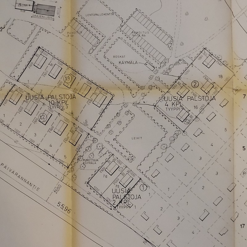 Taivalharjun leirintäalue Päivärannan siirtolapuutarhan naapurissa. Taustalla näkyy Sinipiiantien ja Keijuntien alkupään mökit, sekä silloinen K-Rauta.